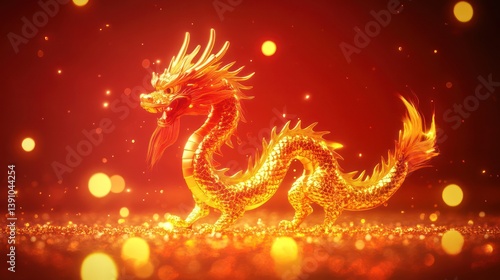 Golden Dragon Figurine on Red Glittery Background, Festive Celebration