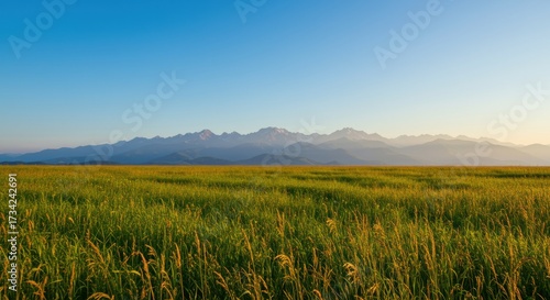 landscape, mountain, field, grass, golden hour, sunrise, sunset, nature, serene, tranquil, panoramic, scenic, vibrant, blue skies, clear sky, peak, majestic, wilderness, outdoors, summer, spring, beautiful, peaceful, horizon, natural beauty, travel, environment, green, huge, expansive, light, morning, evening, dawn, dusk, picturesque, rural, open space, fresh air, view, ecology, growth, meadow, highland, epic