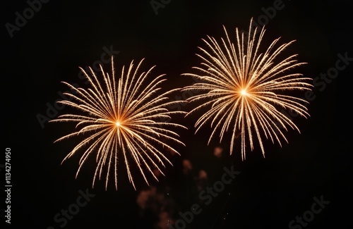 Golden fireworks burst in dark night sky. Two spectacular fireworks display illuminate night. Celebration of holiday special event. Festive, joyful atmosphere. Beautiful glowing gold fireworks