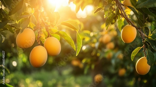 fruit, fruit farm, sunset, gold, sunlight, tree, leaf, ripe, agriculture, nature, harvest, citrous, tropical, summer, sunshine, yellow, farm, plant, growth, food, fresh, organic, sweet, juicy, delicious, healthy, vitamin, natural, vegan, vegetarian, background, image, photo, scene, view, landscape, environment, ecology, botanical, flora, agricultural, cultivation, production, abundance, prosperity, season, maturity