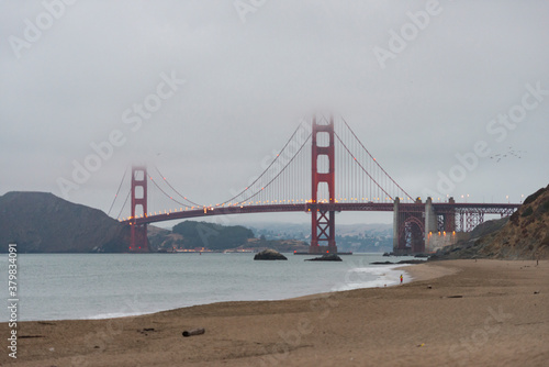 golden gate bridge, dawn, road trip, copy space, vacation, travel, tranquil, sunrise, shore, frisco, rock, red, peaceful, morning, light, idylli, horizontal, golden gate, foggy, fog, epic, bridge, beach