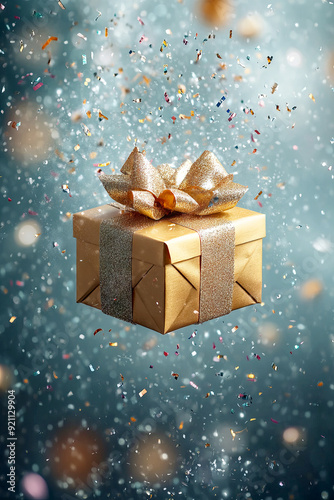 Golden Gift Box with Bow Surrounded by Confetti floats in the air, festive concept