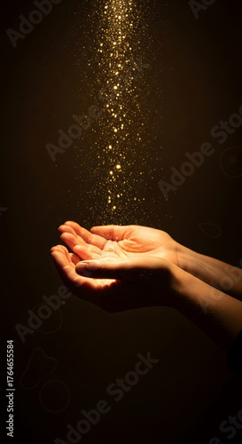 Golden glitter falling onto open hands, dark background, suggesting magic, hope, or receiving a gift, ideal for fantasy or spiritual concepts
