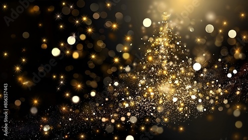 Golden glittering Christmas tree with glowing lights and sparkles on black background