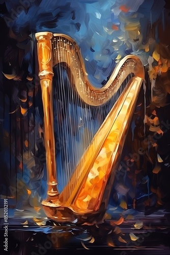 Golden harp in a dark, moody abstract background. Concept of music, elegance, classic instrument. Oil painting. Metaphorical associative card. Psychological abstract picture. Vertical