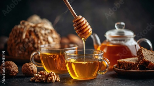 Golden honey drips into a steaming glass of tea, walnuts nearby. A moment of cozy indulgence and natural sweetness. Comfort and warmth.