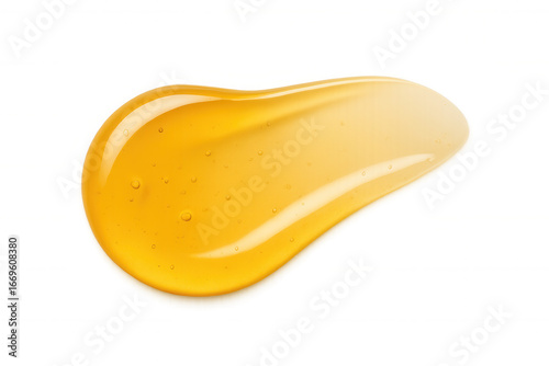 Golden honey drop dripping on a transparent background, creating a viscous texture with bubbles