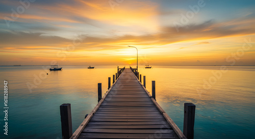 sunset, ocean, dock, pier, sea, boat, water, landscape, horizon, calmness, sunrise, sky, cloud, nature, wooden, paseo, coastline, seascape, dusk, travel, vacation, tour tourism, scenic, beautiful, summer, morning, sunlight, serene, peaceful, relaxation, holiday, destination, calm, environment, outdoors, light, colourful, bright, idylli, paradise