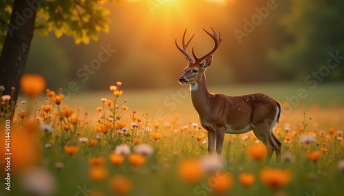 Golden hour light bathes deer amidst blooming wildflowers , woodland, peaceful scene