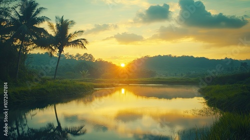 sunset, lake, palm tree, greenery, golden hour, calm, tranquil, peaceful, tropical, nature, landscape, sky, cloud, water, sunrise, morning, evening, outdoors, scenery, beautiful, natural, serene, vibrant, lush