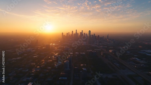 Golden Hour Skyline: Aerial View of Houston at Sunrise