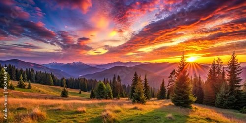 Golden Hour Sunset Over Mountain Range with Pine Forest, mountain, landscape, nature, sunset