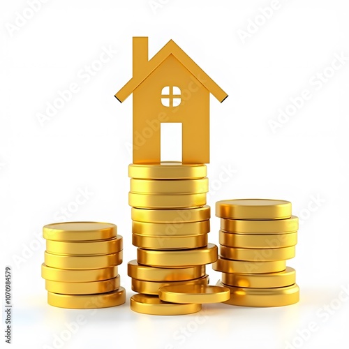 Golden House Model on Stacks of Gold Coins Representing Real Estate Investment ISOLTED ON WHITE BACKGROUND