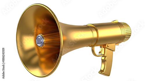 megaphone, gold, metallic, communication, announcement, sound, amplification, vintage, retro, audio, broadcast, loud, speaker, object, symbol, protest, rally, emergency, alarm, warning, tool, equipment, device, singular, isolated, clean, render, three-dimensional, shiny, polished