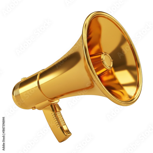 gold, megaphone, three-dimensional, rendering, metallic, finish, transparent, background, handle, design, application, polished