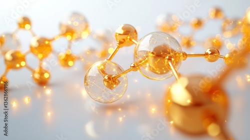 Golden molecular structure with interconnected spheres and brilliant light glow