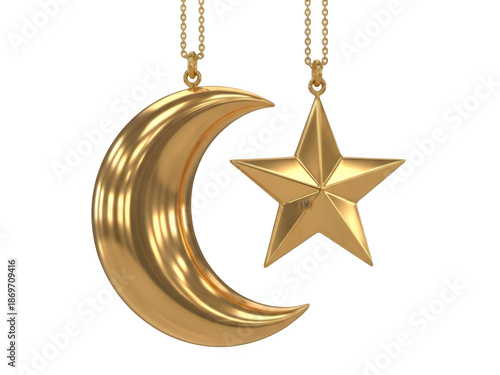 Golden moon and star pendants isolated on transparent background