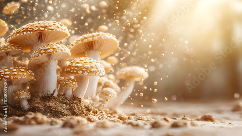 Golden Mushrooms Sprinkled with Light in a Magical Autumn Forest Setting