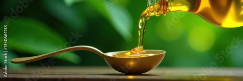 Golden oil flows from bottle, filling spoon against green leaf backdrop, leaves, visual, food
