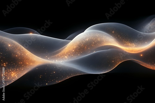 wave, flow, gold, particle, abstract, sparkle, glistering, light, energy, motion, dynamic, texture, background, design, art, digital, futuristic, elegant, luxury, cosmic, nebula, space, swirl, curve, smooth, vibrant, shimmer, glow, bright, dark, pattern, gradient, illustration, style, abstract art, digital artwork, graphic, element, visual