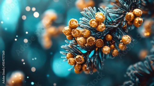 pine cone, pine cone, cone, gold, gold, frosty, frost, winter, christmas, holiday, festive, bokeh, blurred background, out of focus, teal, blue, green, nature, tree branch, branch, tree, evergreen, conifer, closeup, macro, detail, texture, winter landscape, snowy, sparkle, glistering, magic, serene, peaceful, calmness, beauty, natural, elegant, sophisticated, luxury, seasonal, december, jan