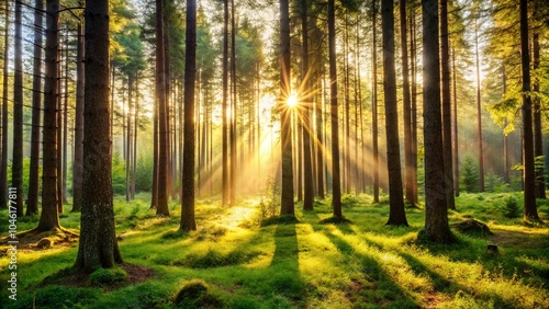 forest, tree, sunlight, sun ray, morning, nature, timberland, greenery, foliage, wood, sunrise, golden light, shadow, peaceful, tranquil, serene, natural beauty, environment, wilderness, scenic, landscape, green, vibrant, bright