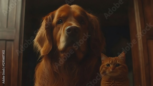 dog, cat, gold, retriever, ginger, pet, animal, friends, furry, companion, indoor, doorway, home, house, love, adorable, cute, sweet, loyal, playful, happy, relaxed, calm, peaceful, warm, cosy, family, together, friendship, bond, portrait, closeup, majestic, beautiful, stunning, image, photo, picture, photo, wildlife, domestic, animal