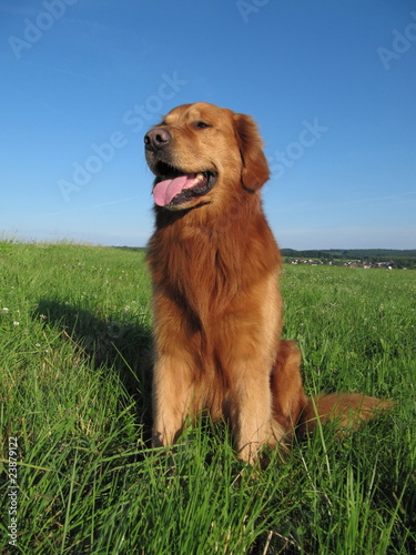 dog, retriever, golden retriever, breed, friendly, gold, fur, hair, gloss, seat, look, watchful, submissive, grass, grass, meadow, far, countryside, nature