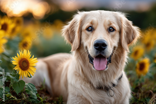 dog, golden retriever, pet, animal, canino, mammal, portrait, sunflower, field, nature, outdoors, summer, sunset, golden hour, happy, cute, adorable, furry, tongue, panting, bokeh, yellow, flower, flower petals, green, leaf, plant, flora, wildlife, countryside, rural, scenic, landscape, background, wallpaper, closeup, eye contact, warm colors, playful, friendly, purebred, domestic, companion, love, loyalty, happiness, joy