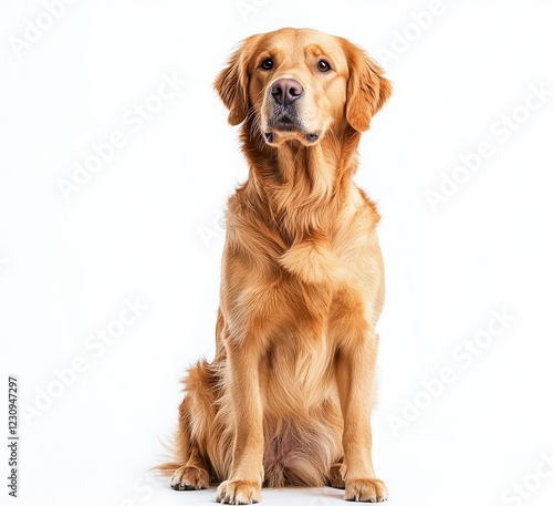 Golden Retriever sitting and looking forward on white background, full-body shot. Perfect for pet-related themes or animal photography.