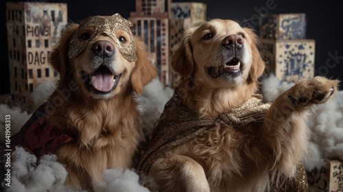 Golden Retriever Superhero Duo with Glitter Capes and City Backdrop