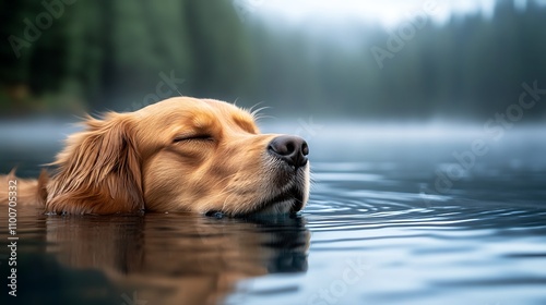 Golden retriever swimming in tranquil lake nature photography