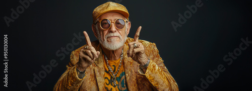 Golden Rockstar Stylish Senior Man in Pixel Glasses Strikes a Pose on Black Background