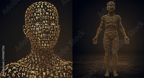 android, rune, gold, figure, body, ancient, symbol, letter, alphabet, script, mysterious, enigmatic, digital, art, three-dimensional, render, model, design, graphic, artwork, illustration, abstract, texture, pattern, gold, rune, character, glyphs, inscription, mythology, legend, mystery, secret, cognition, wisdom, culture, history, past, future, timeless, dark, background