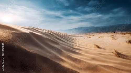 desert, dune, sand, landscape, sky, arid, nature, wilderness, dry, hot, texture, wave, pattern, ripple, gold, brown, yellow, blue, cloud, sunlight, bright, light, shadow, depth, scenic, view, natural, remote, expanse, horizon, terrain, geology, earth, dirtied, dust, barren, extreme, solitude, peace, quiet, serene, beauty, travel, journey, atmosphere, dynamic, raw