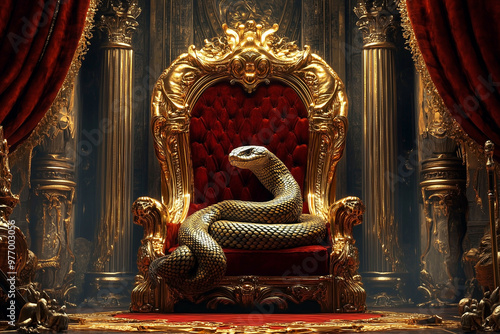 Golden snake, King of Cobra on a grand ornate throne placed in an opulent throne room. Chinese Zodiac 2025 is the year of the Snake.