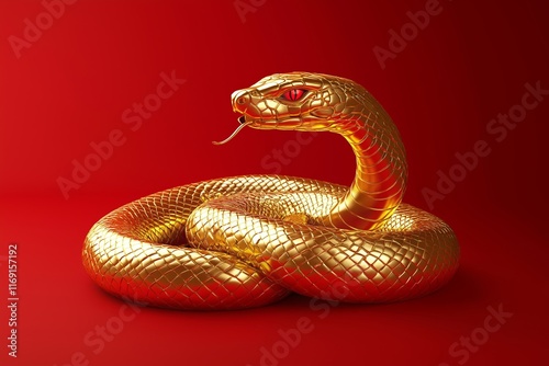Golden snake sculpture on vibrant red background, symbol of 2025 year