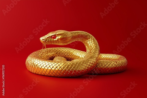 Golden snake sculpture on vibrant red background, symbol of 2025 year