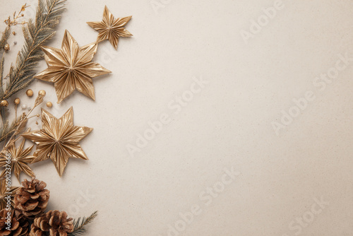 Golden stars and pine cones create festive holiday arrangement on beige background, evoking warm and elegant seasonal atmosphere