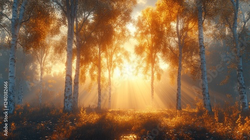 Golden Sunlight Illuminates Autumnal Birch Forest