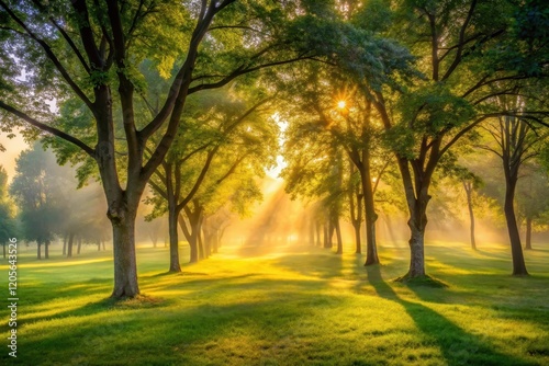 sunrise, tree, sunbeam, fog, mist, grass, green, nature, peaceful, serene, tranquil, morning, sunlight, light, shadow, park, landscape, scenic, environment, beauty, idylli, picturesque