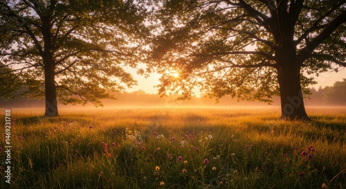 Golden sunrise bathes peaceful meadow two majestic oak trees stand tall serene nature scene