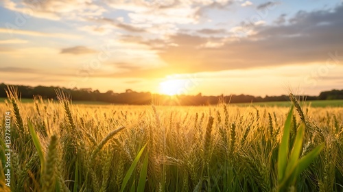 Golden sunset over a wheat field with close up view of the crops swaying in the gentle breeze : Generative AI