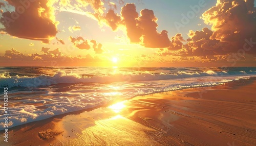Golden Sunset Over Calm Ocean Waves on Sandy Beach with Dramatic Clouds, HDR Cinematic Photography