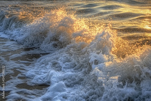sunrise, wave, ocean, beach, shore, gold, light, water, foam, spray, sea, coast, morning, sunset, nature, beauty, calm, energy, powerful, dynamic, sea foam, texture, detail, golden hour, horizon, sand, wet, bubble, refreshing, coastline, seacoast, coastal, travel, vacation, tour tourism, relaxation, calmness, photo, landscape, golden light, morning light, sunlit, beautiful