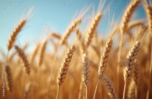 Golden wheat ears sway gently in field under clear blue sky. Ripe grain ready for harvest. Rural landscape signifies abundance and summer bounty.
