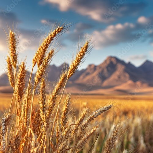 Golden wheat field at sunset, mountains in background