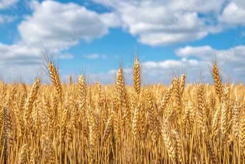 wheat, field, agriculture, harvest, crop, rural, nature, farming, gold, sunny, blue skies, cloud, landscape, countryside, plant, growth, serene, organic, summer, grain, stalk, environment, seasonal, ripening, yellow, sunshine, earth, fresh, vibrant, lush, horizon, natural beauty, wild