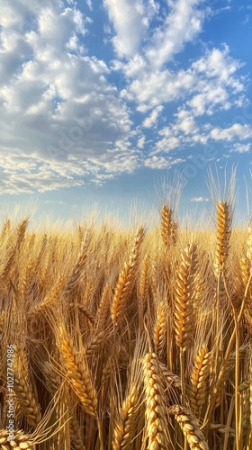 Golden wheat field under a bright blue sky with fluffy clouds, showcasing nature's beauty and agricultural richness.
