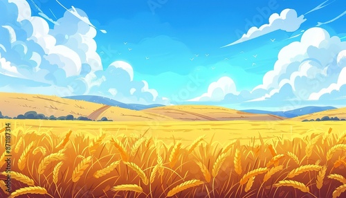 Golden Wheat Field Under a Sunny Summer Sky With Rolling Hills, cartoon